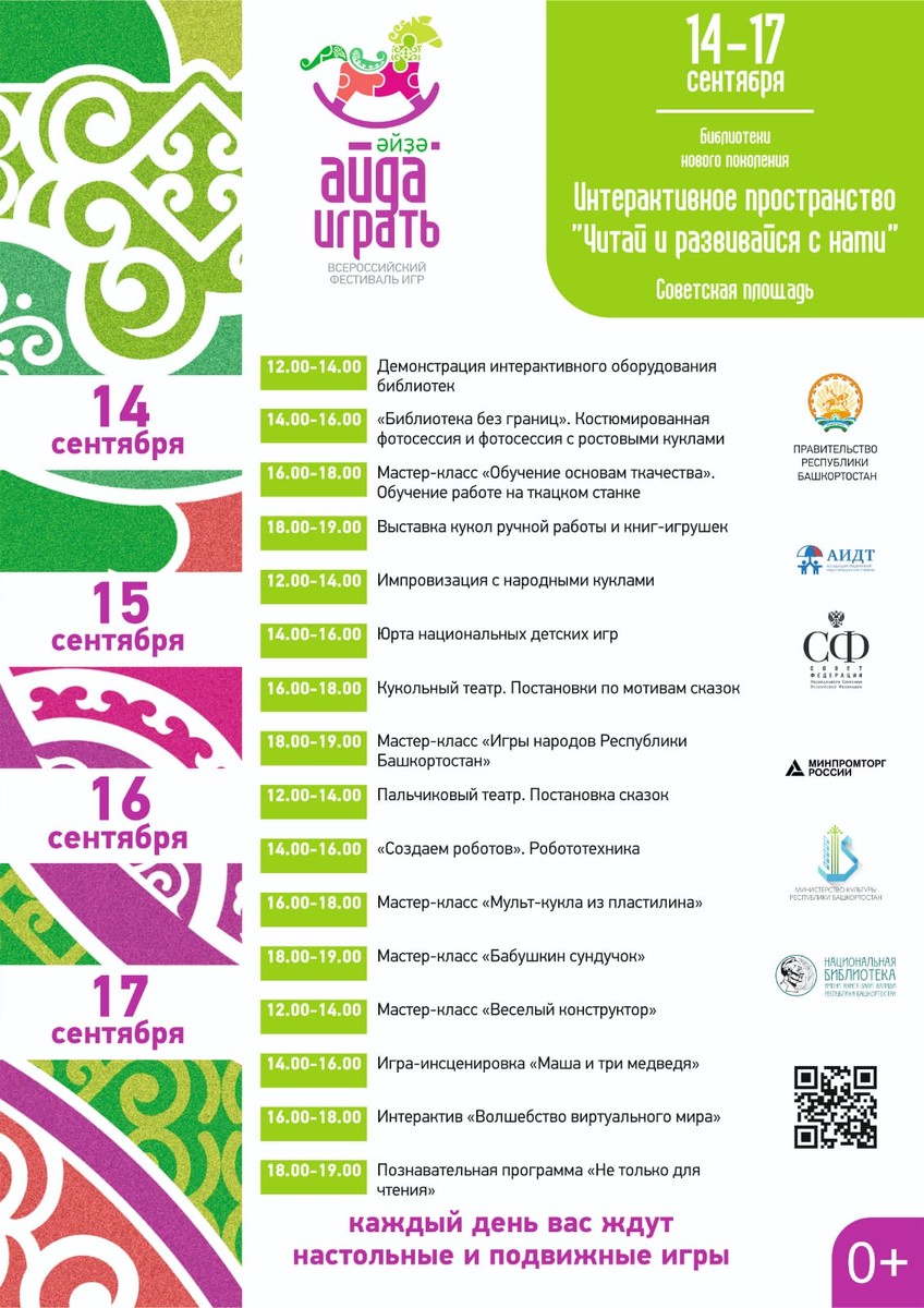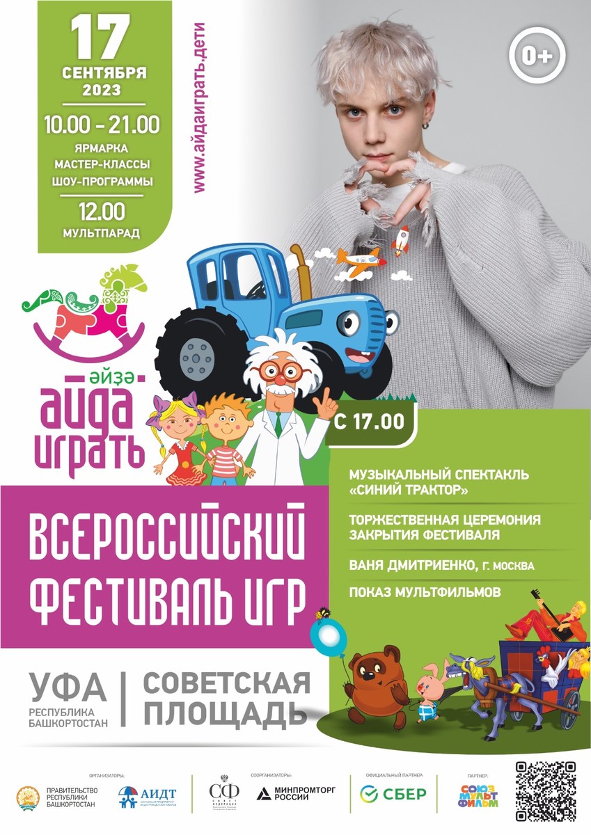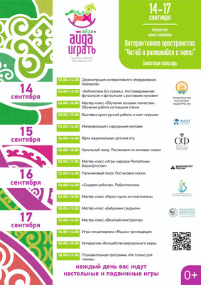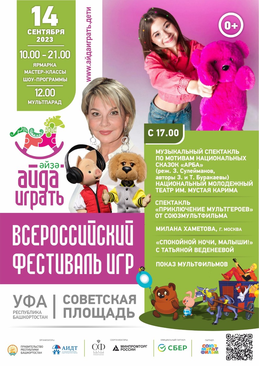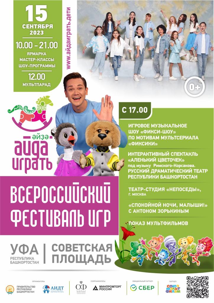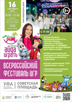 | 14 - 17 сентября 2023 г. по инициативе Главы Республики Башкортостан Радия Фаритовича Хабирова впервые пройдет Всероссийский фестиваль игры «Айда играть». Организаторами мероприятия выступают: Правительство Республики Башкортостан, Ассоциация предприятий индустрии детских товаров при поддержке Совета Федерации Федерального Собрания РФ, Министерства промышленности и торговли РФ и Министерства просвещения РФ, Российской академии образования. Фестиваль станет уникальной площадкой для специалистов науки, промышленности, образования и родительского сообщества по вопросам развития игровой культуры, значения игр и игрушек в воспитании детей. В рамках фестиваля «Айда играть» производители, разработчики и изобретатели игр и игрушек, товаров визуального анимационного контента для детей, а также дизайнеры и мастера-ремесленники со всей России обменяются опытом, обсудят новые возможности для развития отрасли детских товаров. Ключевым событием деловой программы мероприятия станет пленарная сессия «Больше, чем игра: роль, значение и точки роста игропрома России», к участию в которой приглашены: Глава Республики Башкортостан Радий Хабиров председатель Комитета Совета Федерации по науке, образованию и культуре Лилия Гумерова, начальник Управления Президента Российской Федерации по общественным проектам Сергей Новиков, президент Ассоциации предприятий индустрии детских товаров Антонина Цицулина, Уполномоченный при Президенте Российской Федерации по правам ребенка Мария Львова-Белова, руководители профильных региональных органов власти, Минпромторга и Минпросвещения России, ведущие отечественные производители игр и игрушек. В дискуссии также примут участие представители делегации Ирана во главе с руководителем отдела игрушек аппарата вице-президента Ирана по науке и технологиям Моххамадхоссейном Нахчи, которые представят свой уникальный опыт развития индустрии детских товаров. В рамках деловой программы пройдет всероссийская научная конференция «Ребенок и игра в эпоху глобальных трансформаций» и ряд практических лекториев для бизнеса. В течение четырех дней на Советской площади будет организована выставка игрушек российских производителей, демонстрация лучших игровых детских практик, тест-драйв игрушек. Гостей и участников фестиваля также ждет насыщенная программа: тематические конкурсы и мастер-классы, спортивные турниры, кинопробы, открытая детская телестудия, выступление популярных детских коллективов «Непоседы», «Домисолька», а также Вани Дмитриенко и Миланы Хаметовой, развлекательная программа «Спокойной ночи, малыши!» с любимыми ведущими Татьяной Веденеевой и Оксаной Федоровой, мультпарад и показы лучших детских спектаклей и анимационных проектов, праздничный флешмоб с участием героев «Союзмультфильма». В рамках мероприятия Национальный музей Башкортостана представит выставку редких игрушек. Кроме этого, будет работать территория для детей с ограниченными возможностями здоровья, где будут представлены тактильные игрушки, пройдут мастер-классы для родителей. На фестивале «Айда играть» пройдет один из этапов всероссийского конкурса «Выбор детей». Производители российских игр и игрушек, лауреаты Национальной премии «Золотой медвежонок» представят на площадке свои новинки, которые пр